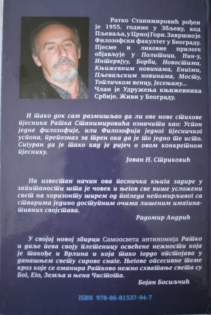И тако док сам размишљао да ли ове нове стихове пјесника Ратка Станимировића означити као: Успон једне филозофије, или Филозофија једног пјесничког успона, препознах за трен ока да је то једно те исто. Сигуран да је тако кад је ријеч о овом конкретном пјеснику. Пјеснику који није морао да студира и успјешно заврши филозофију, и филозофске науке јер је већ по неком запису, који можемо назвати коинци-денција речено модерним језиком, или судбински однос, у сваком случају ријеч је о коду или ходу слободоно можемо рећи – као материјални супстрат, који у пароксизмима, у једном временском простору, баш овде исказао своје богатство. Рекох богатство али не оно које сужава човекове моћи, него оно богат-ство које шири његове могућности у духовном успону који је spiritus movens y овом песнику нашао или наишао на двије могућности: на поетски занос и филозофски трактат. Збиља, мало је пјесника који се тако лако могу препознати као што је Станимировић у коме су филозофија и пјеснички занос једно те исто са различитом тематиком. Једно је говор, друго је слика. Баш слика која употпуњује и синергично дјелује на ријеч, баш као што ријеч облачи и употпуњује ту слику. Све је ово цјелина једног успјеха које препознах као дио једне цјелине коју у претходном казивању о пјеснику Станимировићу рекох да су то његове снохватице, и ето те снохватице испунише моју мисао о овом пјеснику о коме рекох ово до сада што рекох. Ако се једна научна доктрина која представља истину или филозофски трактат обликује поетским исказом и његовим изразом, онда је то најбољи доказ о природи стваралачког духа пјесника Станимировића.