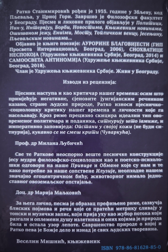 Што се тиче првог начела уврежено је мишљење да се песник рађа, а не постаје. Као потврду таквом ставу навешћемо пример Јесењина као једног од највећих руских, а и светских поета, па и Добрицу Ерића као истакнутог српског песника. Ни један ни други нису били високо систематски школовани, а насупрот њима многи високо школовани песници нису досегли висину и дубину њиховог песничког израза и луцидности њихових стихова. О таленту песника Ратка Станимировића говорили су и писали рецезенти његових претходних збирки поезије. Од професора др Јована Н. Стриковића који је као поета и психијатар изрекао тврдњу да песник Станимировић „није ни свестан шта све зна“, дивећи се његовим песничким творевинама, а посебно песми „Его“. Ту су и мишљења песника: Драгана Колунџије, Радомира Андрића, Божидара Глоговца, Милице Јефтимијевић-Лилић, Драгана Ускоковића, Бојана Босиљчића и других који су похвално писали о Ратковој поезији.